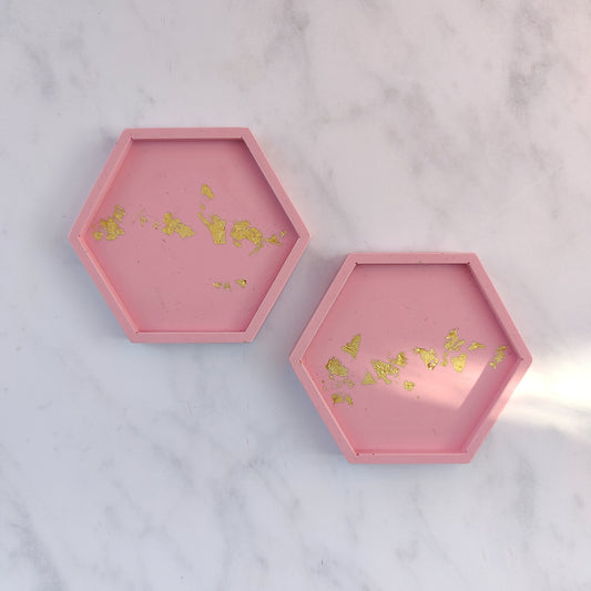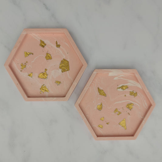 Salmon Pink With Gold Leaf Hexagon Coasters Set Of 2