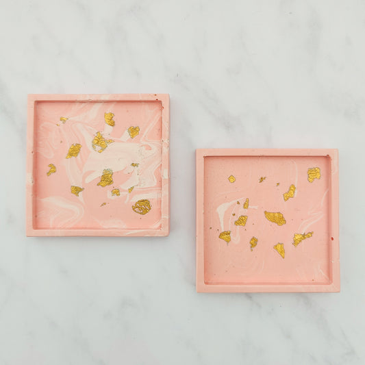 Salmon Pink With Gold Leaf Square Coaster Set Of 2