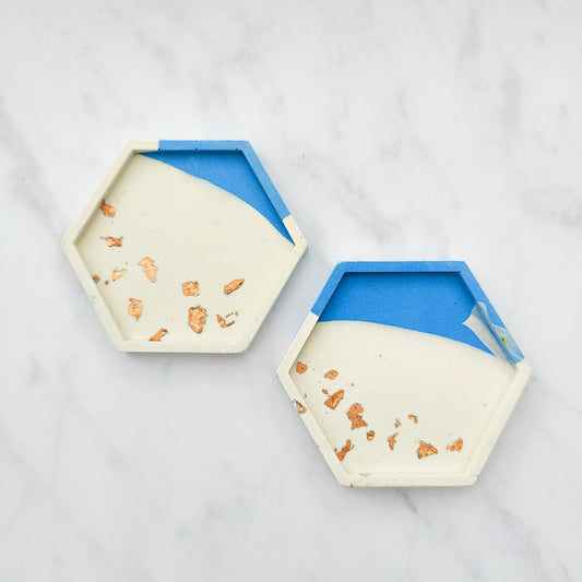 Dipped Ocean Blue With Rose Gold Leaf Hexagon Coaster Set Of 2
