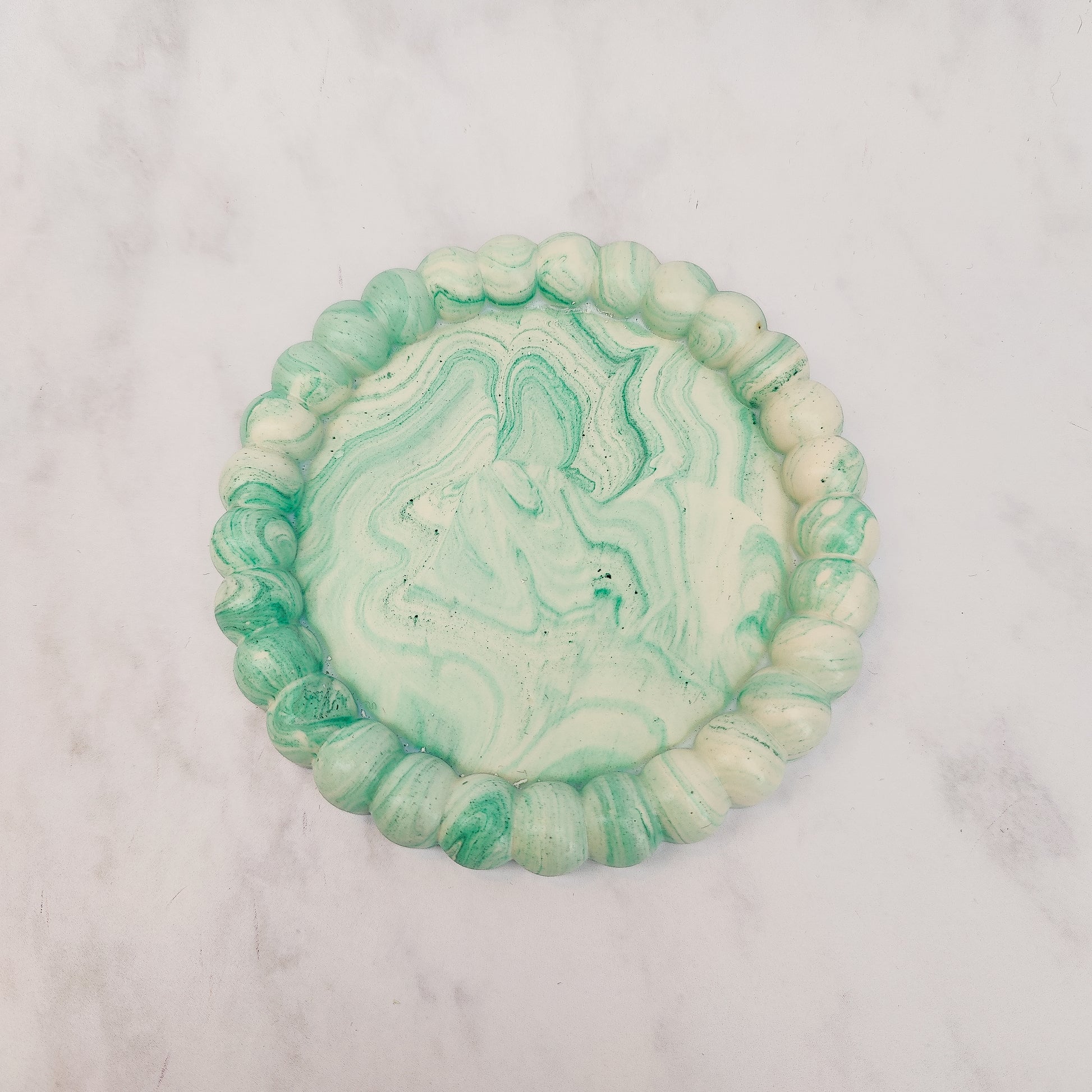 Bring bold character and artisan charm to your home with this handcrafted Jesmonite tray, featuring a playful scalloped edge and green marble swirls. Each piece is individually poured, creating a unique pattern that ensures no two trays are ever the same.